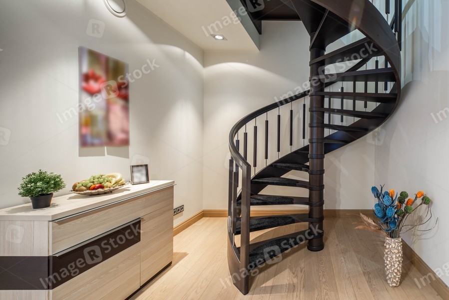 Light studio apartment. Modern interior. Stairs.