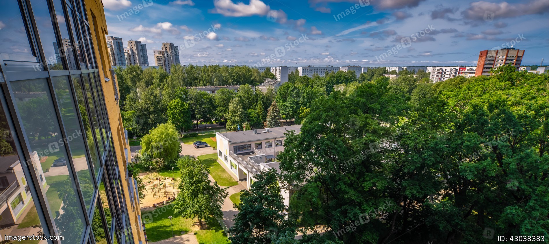 Top view from window of city at sunny summer day. Modern exterior of glass office building.