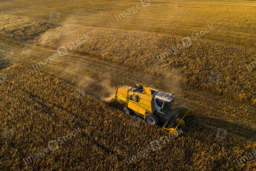 View from above. Combine harvester. Agricultural landscape.