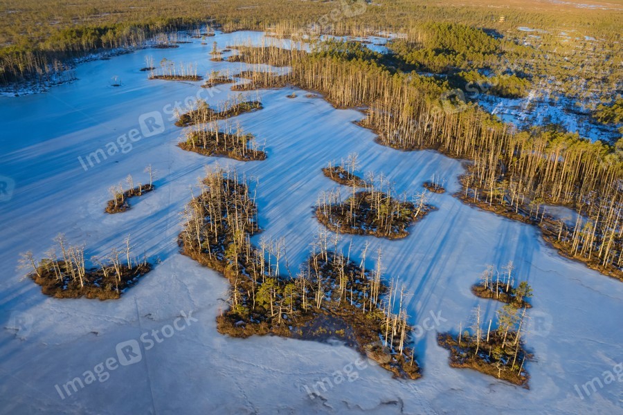 Scenic landscape of swamps at sunny day at early spring.