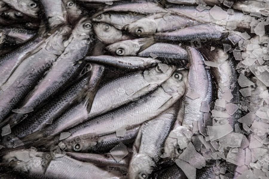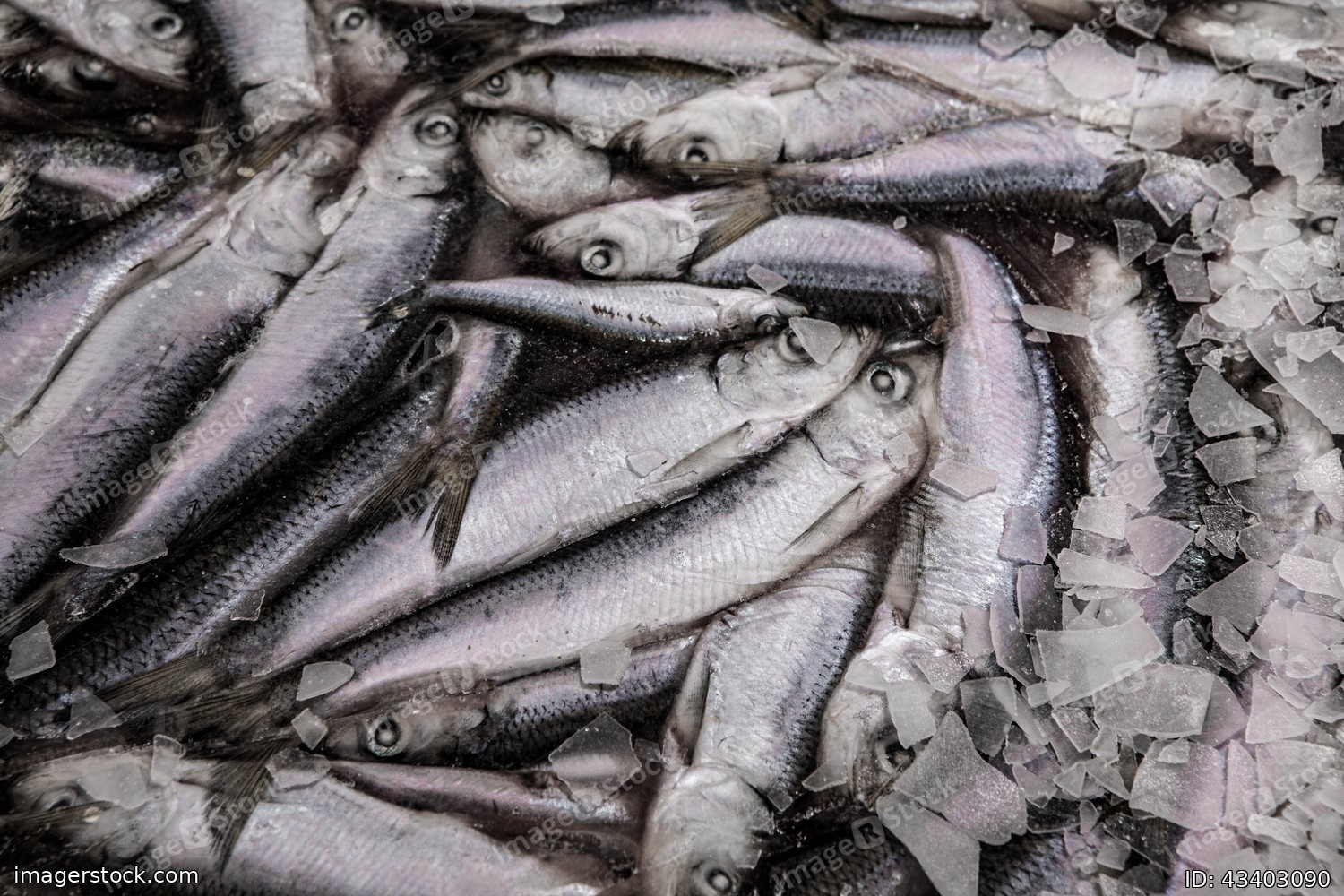 Close-up of frozen sprat in fish market. Winter fishing. Small silver fish production.