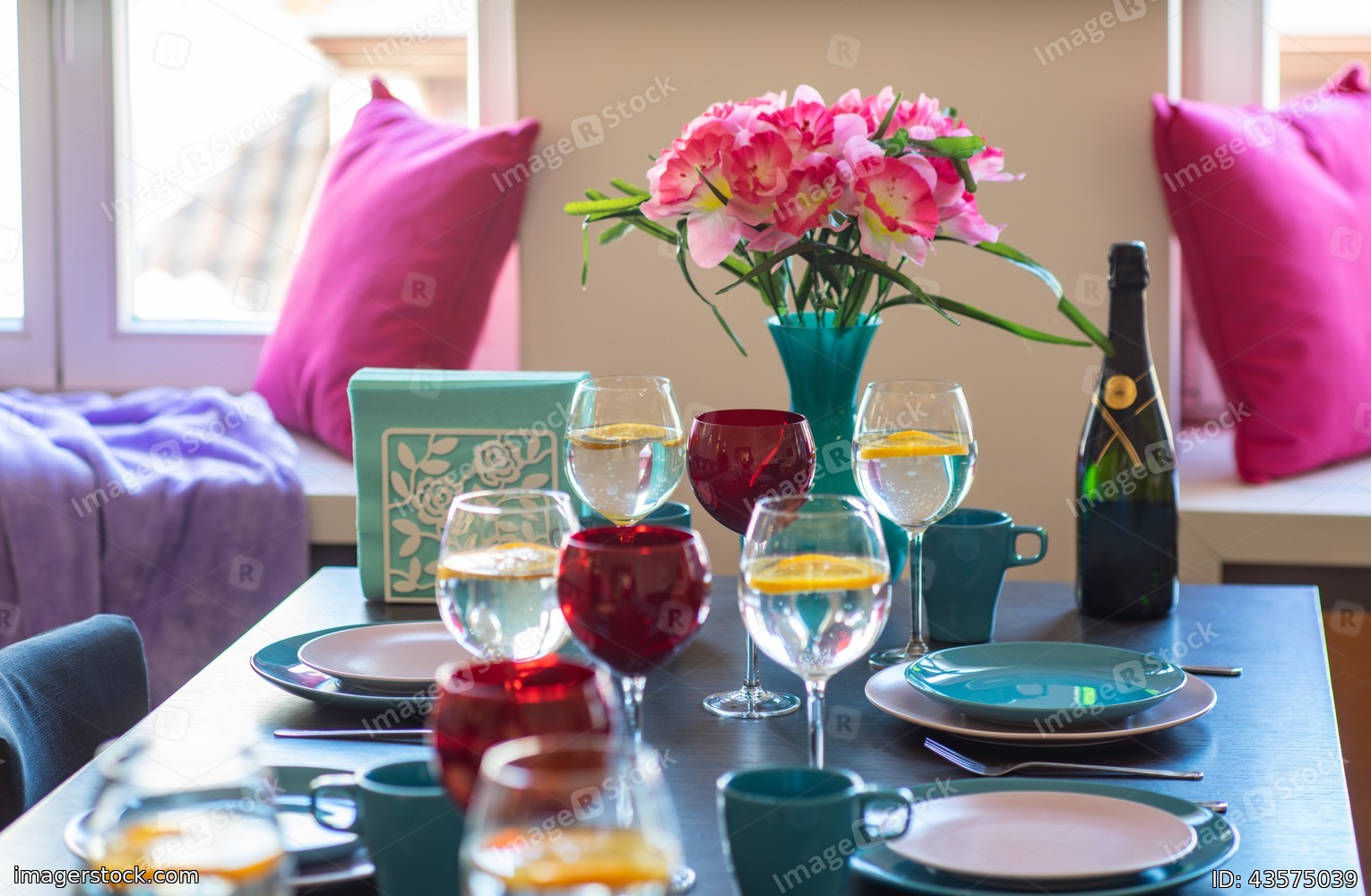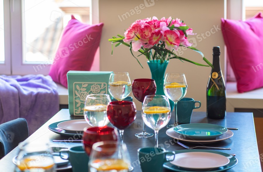 Close-up of served table. Vaze with flowers.