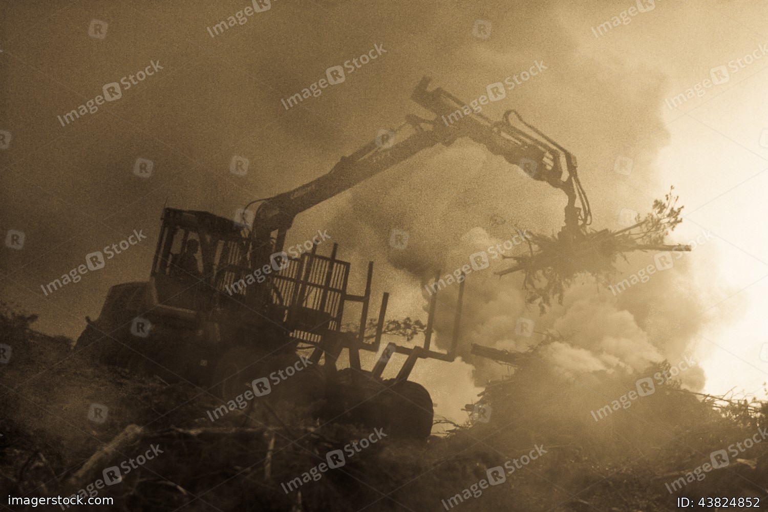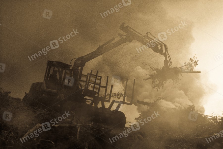 Forest cutting, burning of forest waste. Smoke and fire, tractor.
