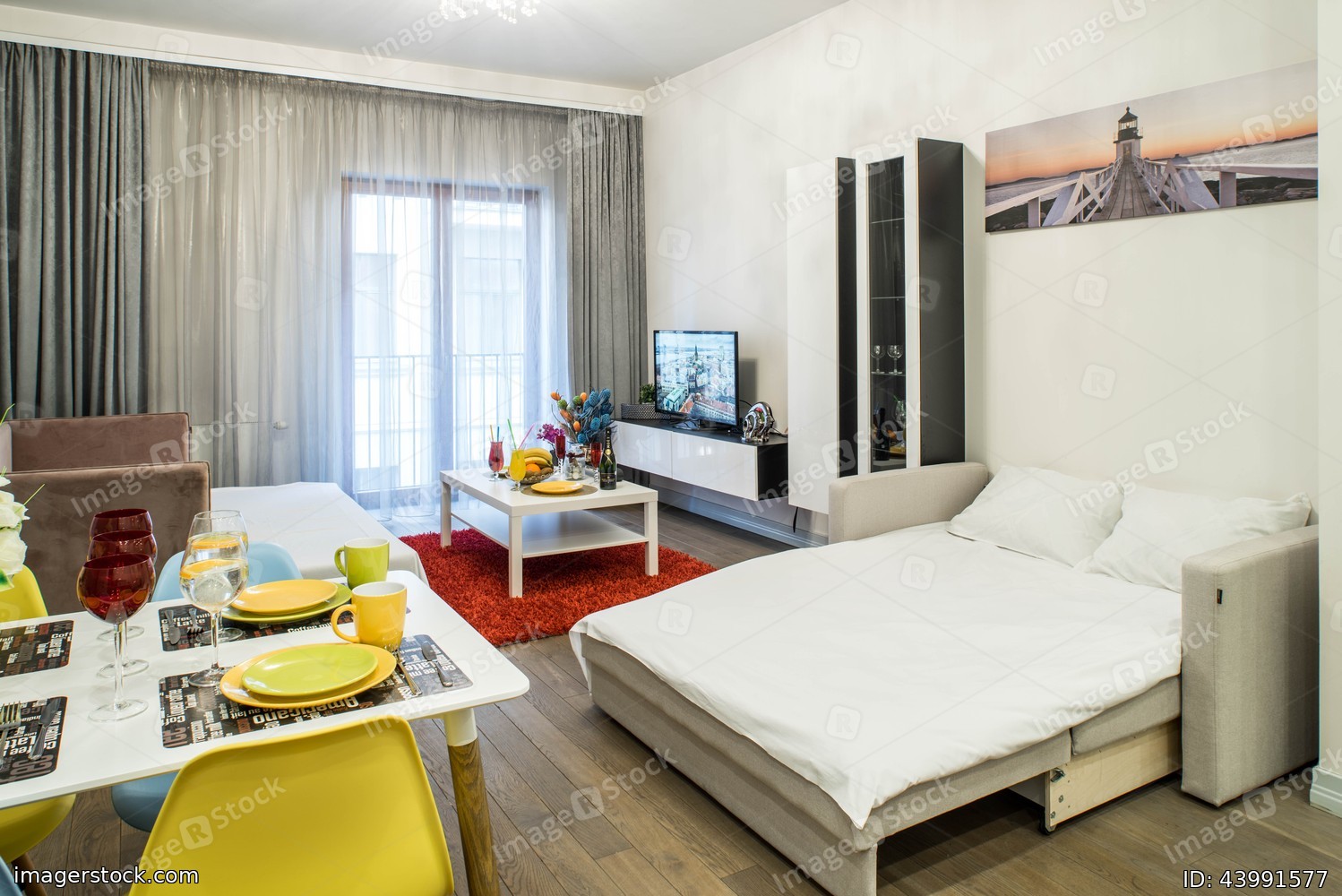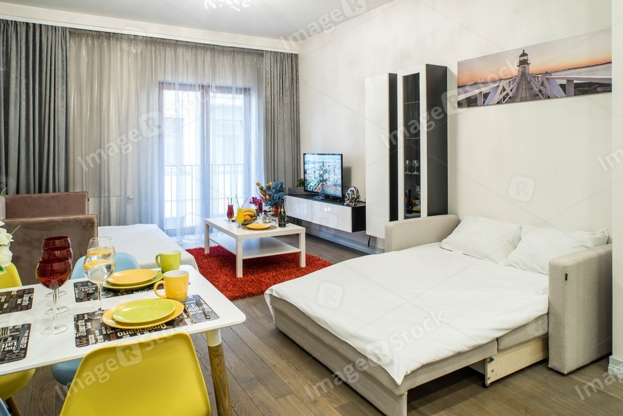 Modern interior of living room with furniture and tv.
