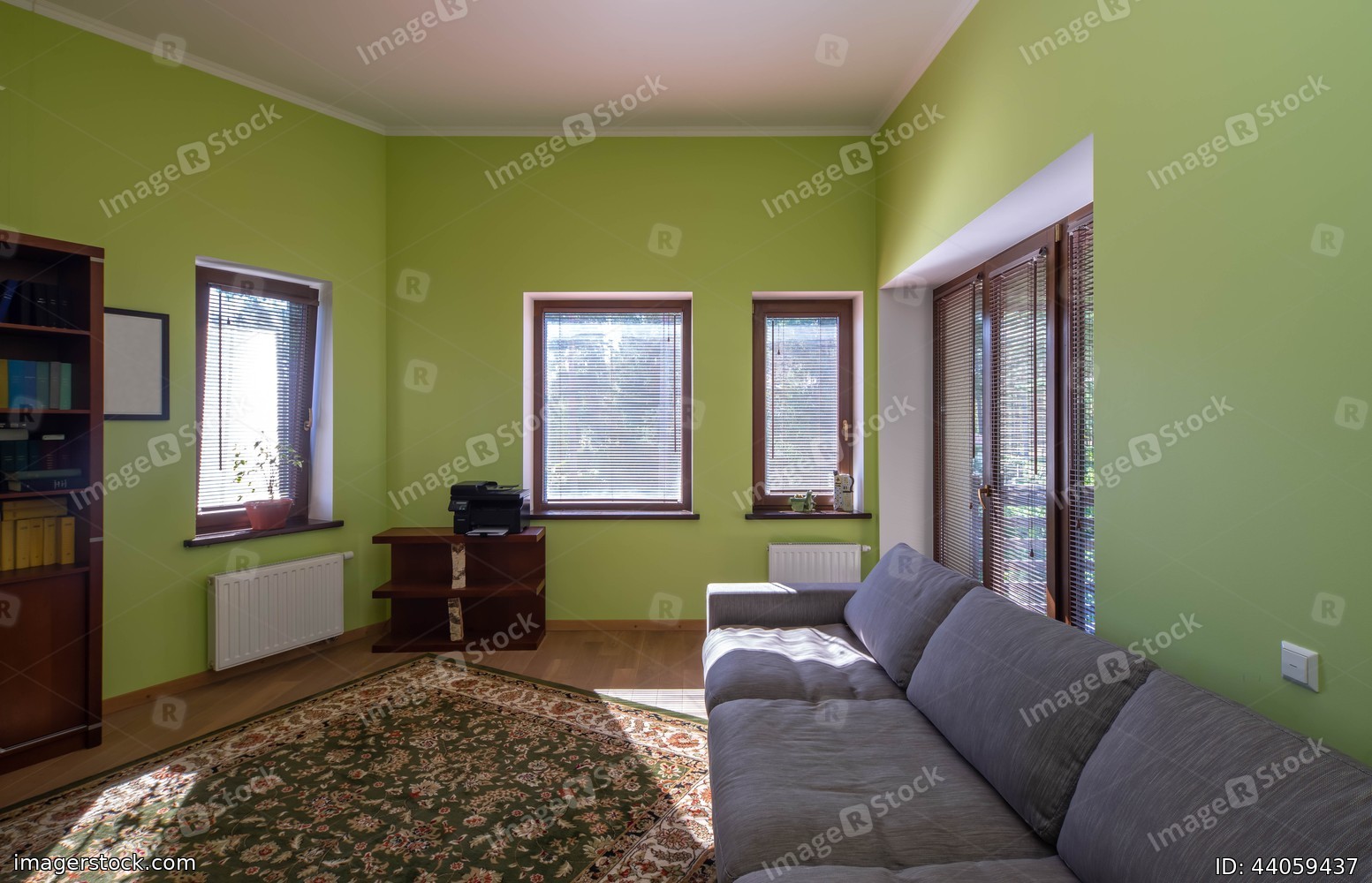 Interior of home office room in cottage. Soft couch. Printer on shelf. Wooden bookcase.