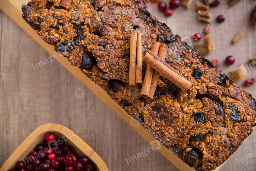 Homemade fruit bread with cosy winter decorations