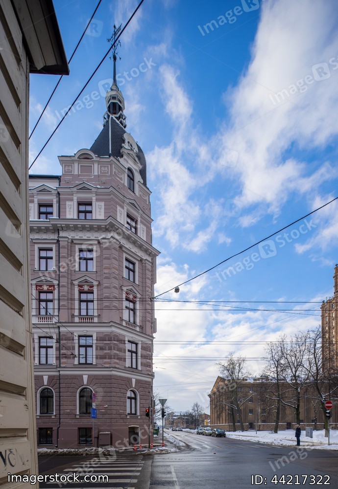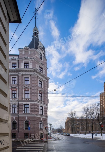 Winter cityscape of Riga. Modern architecture. Snow on road.