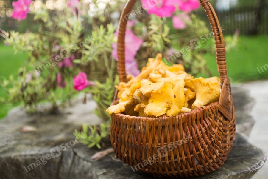 A mushroom basket full of chanterelles in autumn