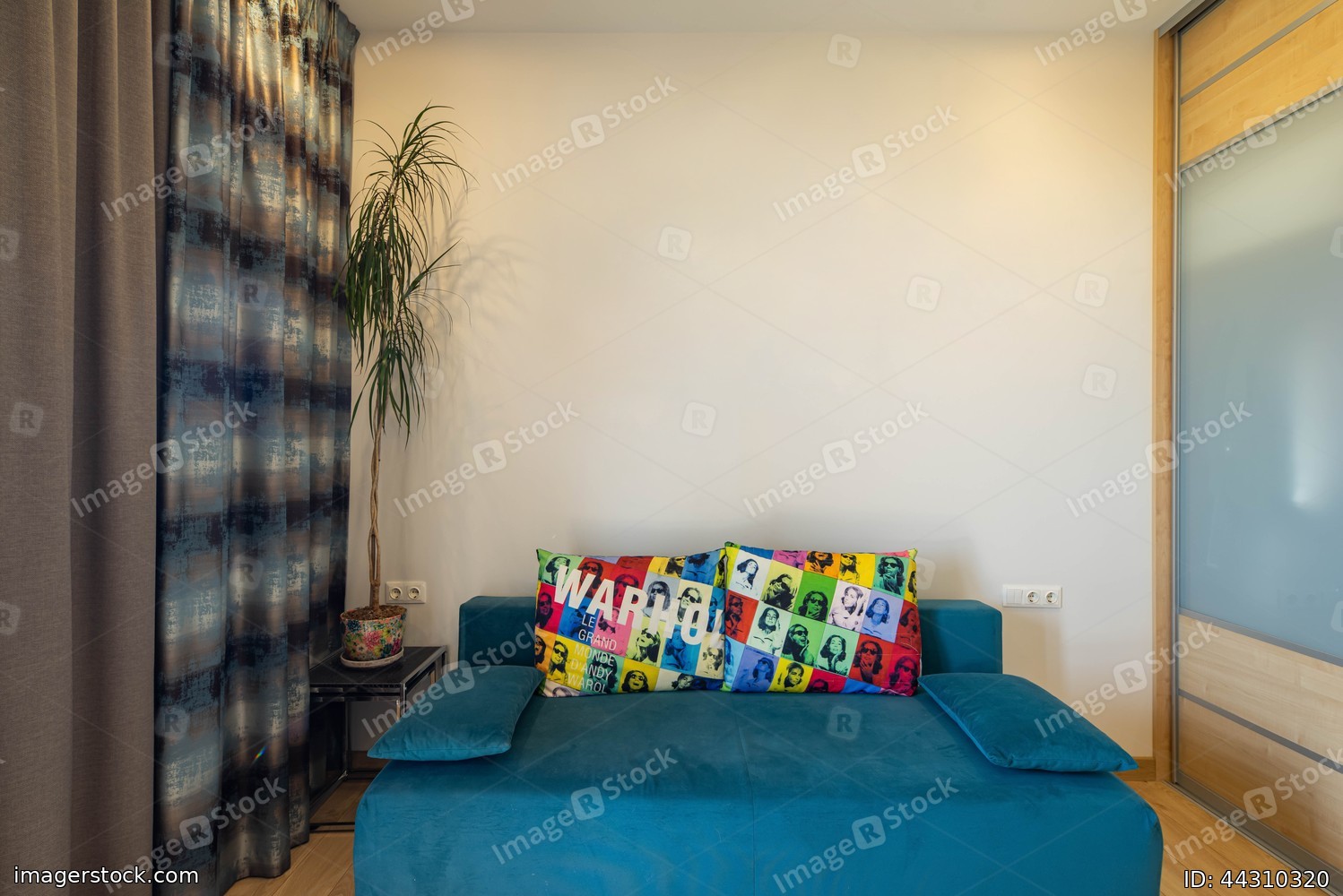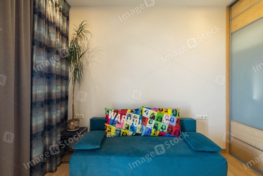 Contemporary interior of living room in modern apartment. Cozy blue couch with pillows. Green palm.