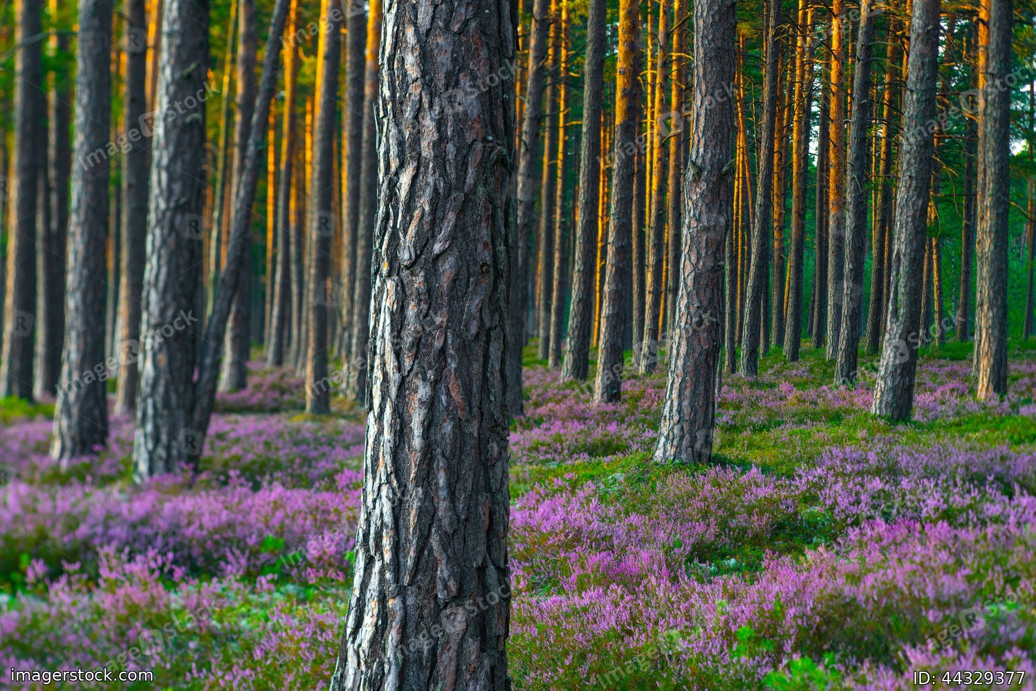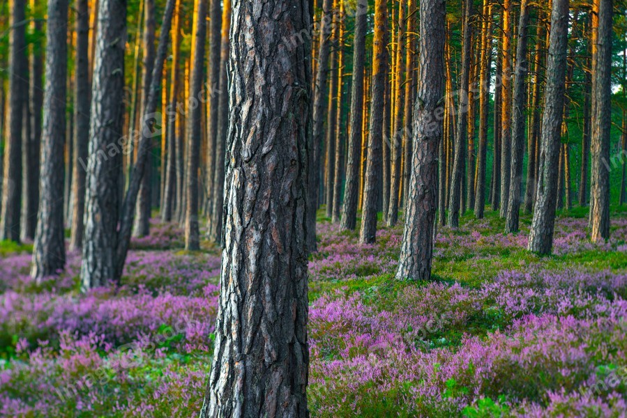 Sunny day. Blooming heather. Beautiful lawn in the forest.