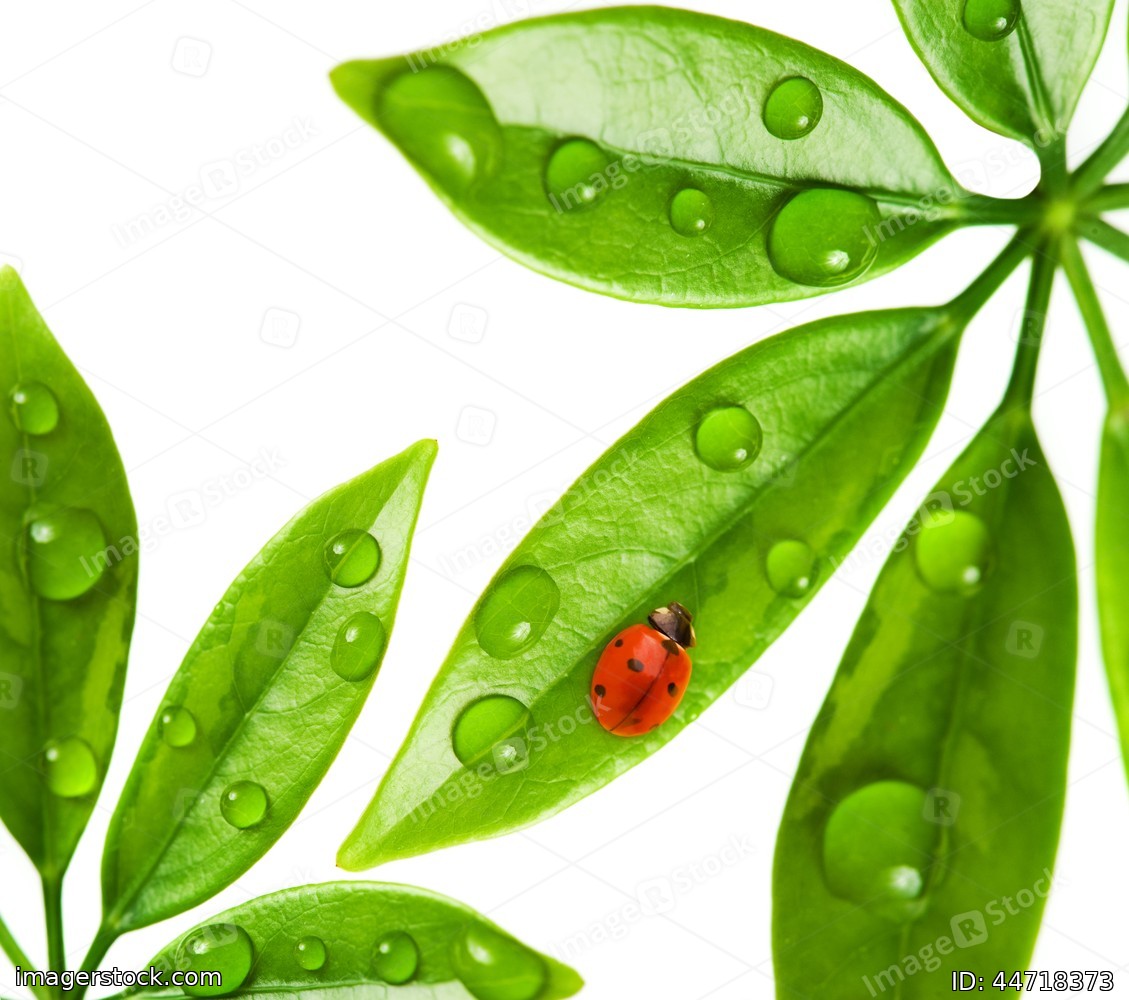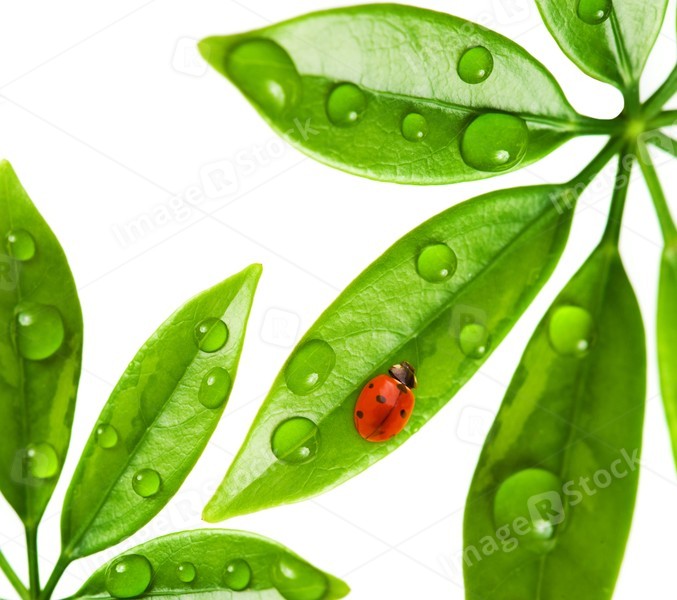 Ladybug sitting on a fresh green leaf.