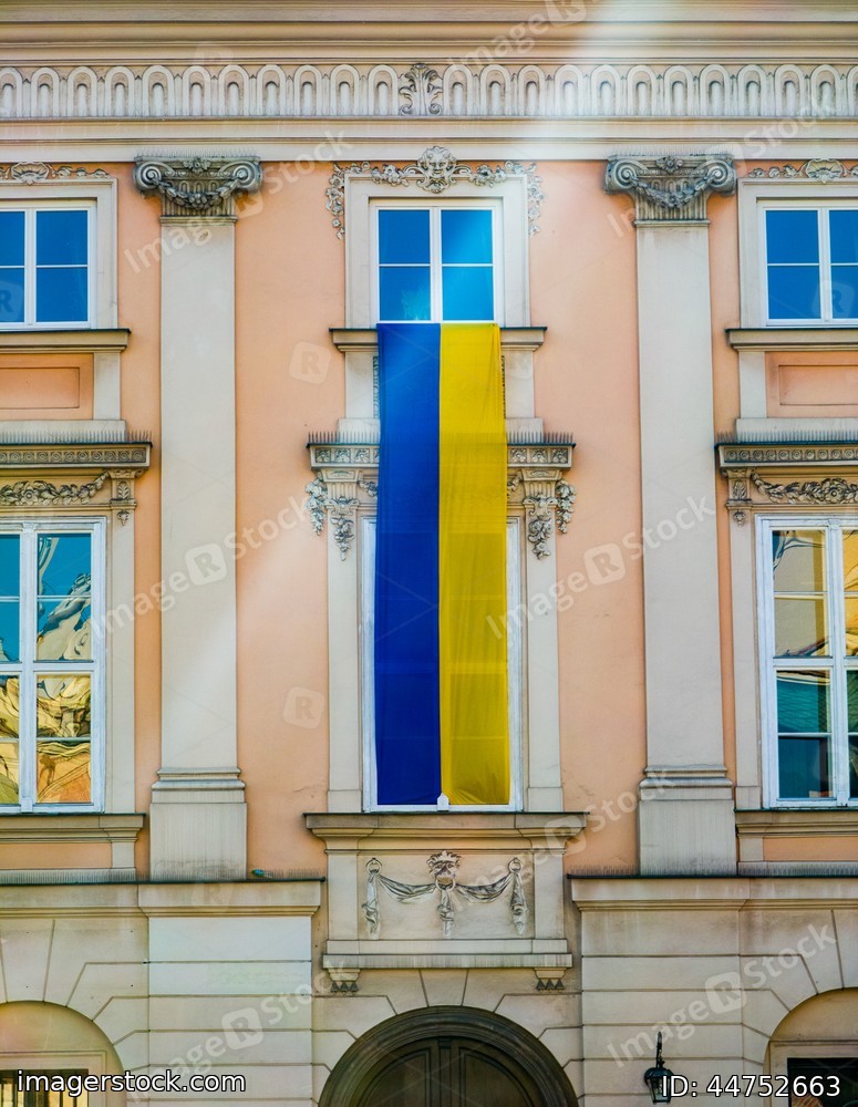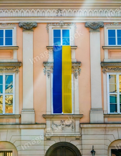 Facade of modern building in Krokow. Support of Ukraine. Flag on wall.