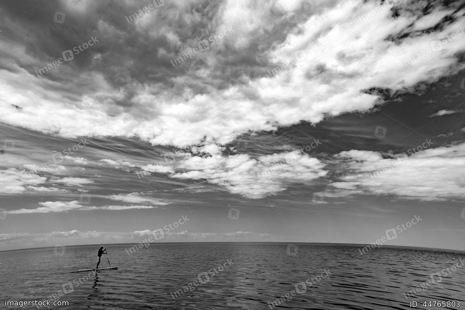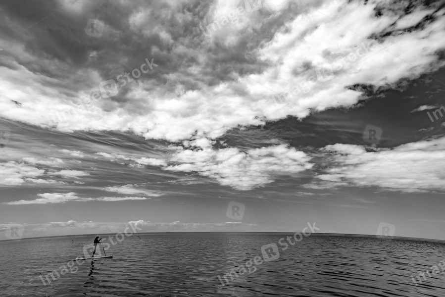 Scenic seascape of calm sea and sky with clouds. Man on sup board