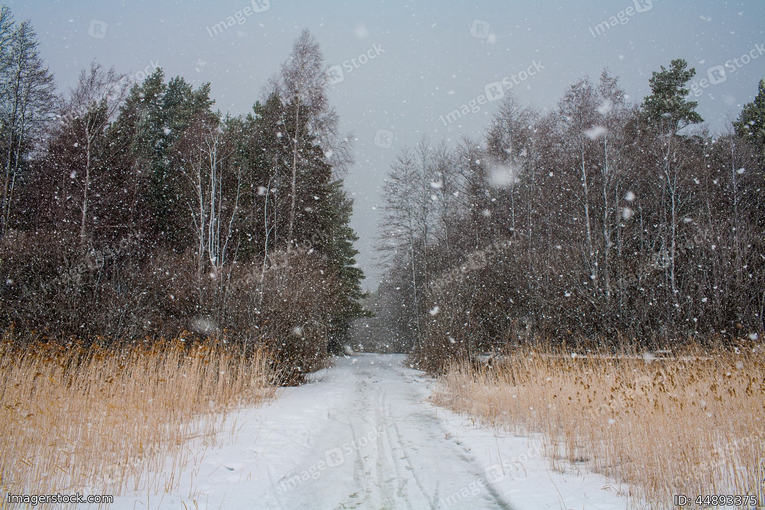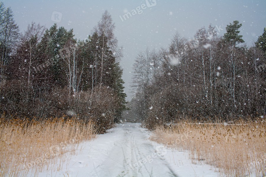 Snowfall, large snow flakes on the background of the forest and the lake.