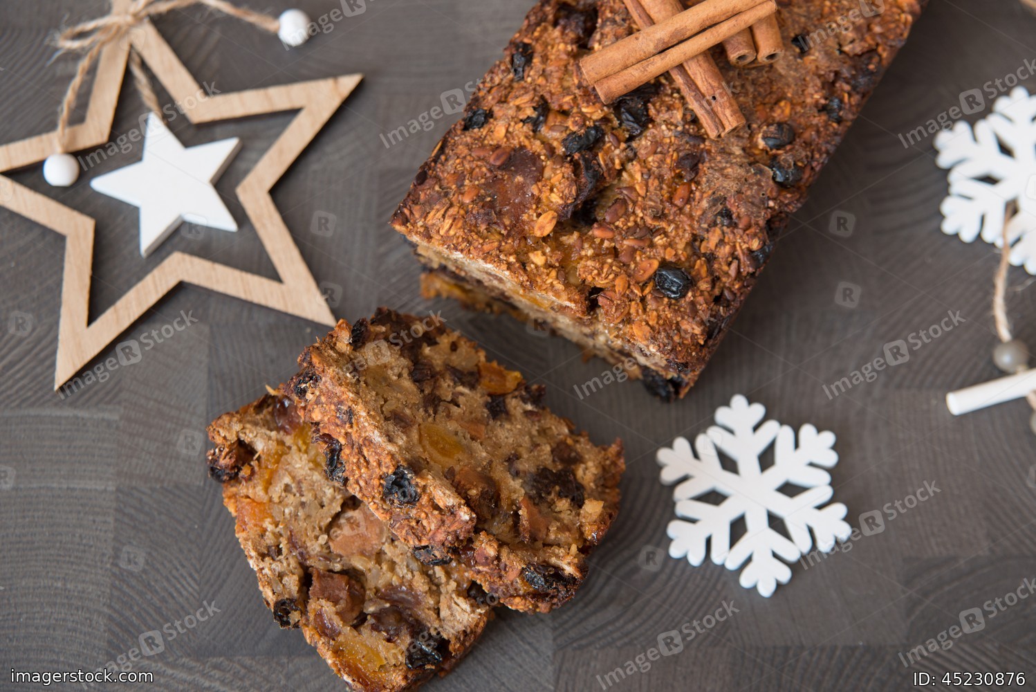 Homemade fruit bread with cosy winter decorations