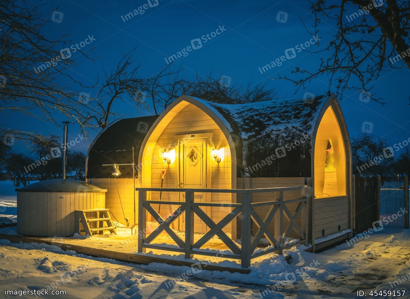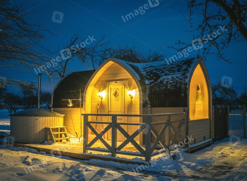 Wooden cabin (finnish sauna) at winter night.