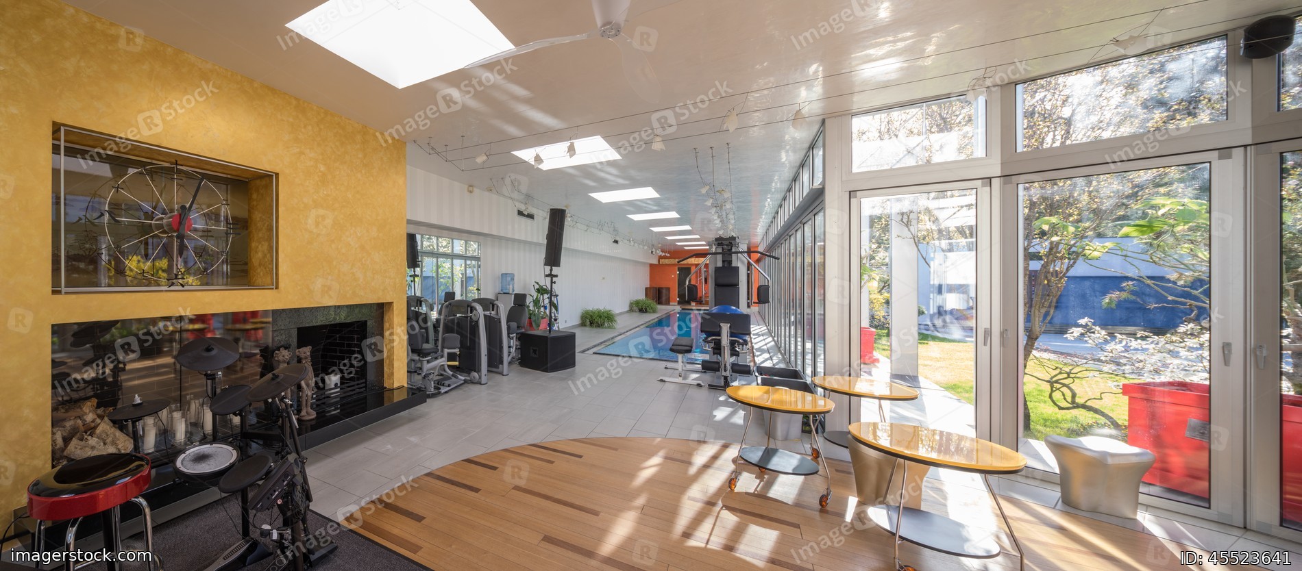 Modern interior of luxury private house. Musical equipment. Pool.