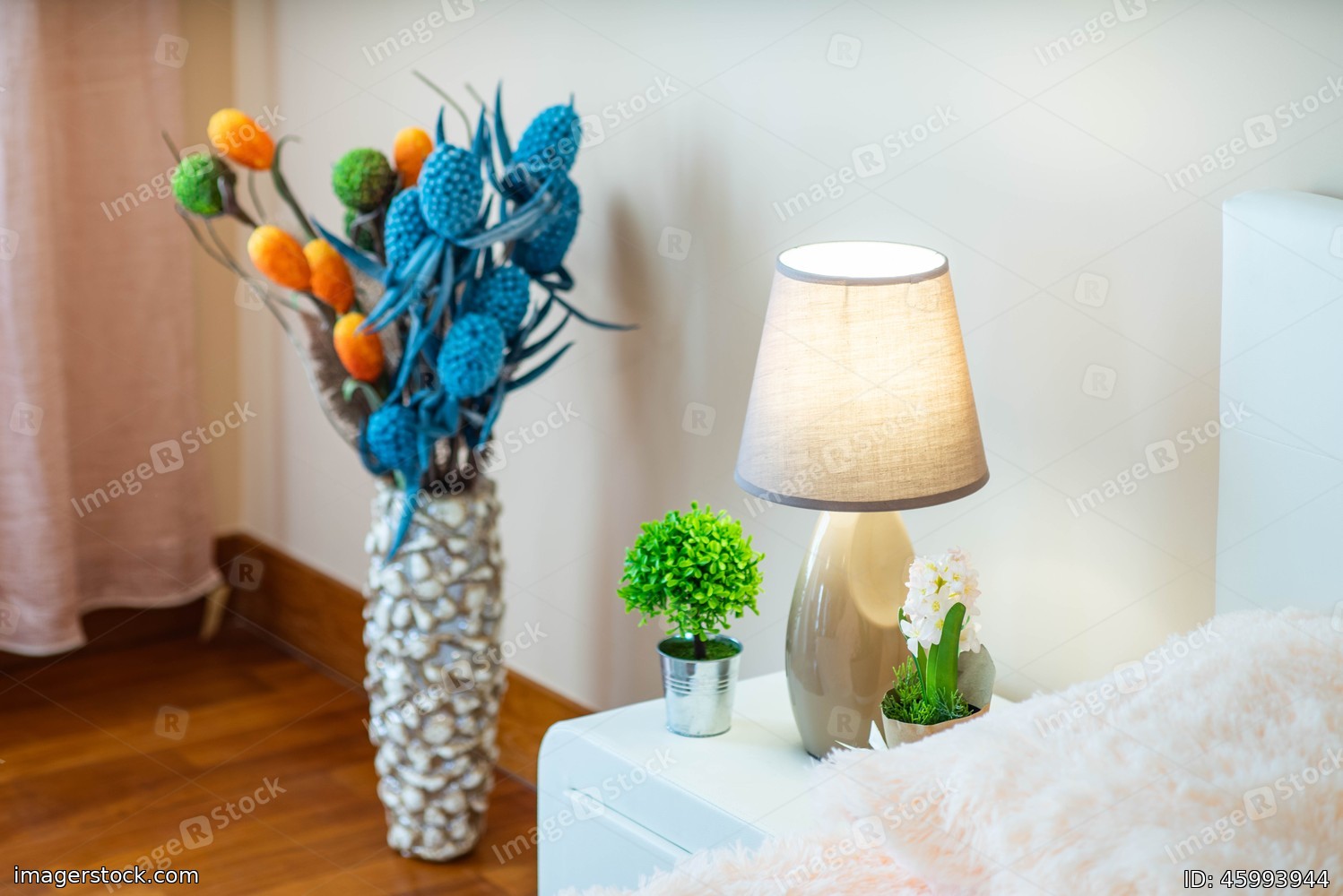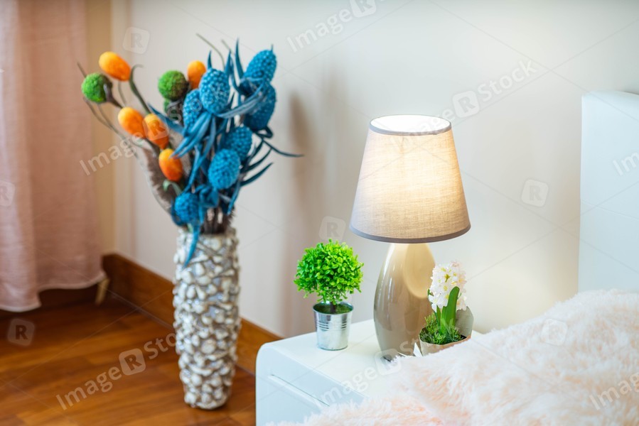 White bedside with lamp and flowers. Decorative vase on the floor.