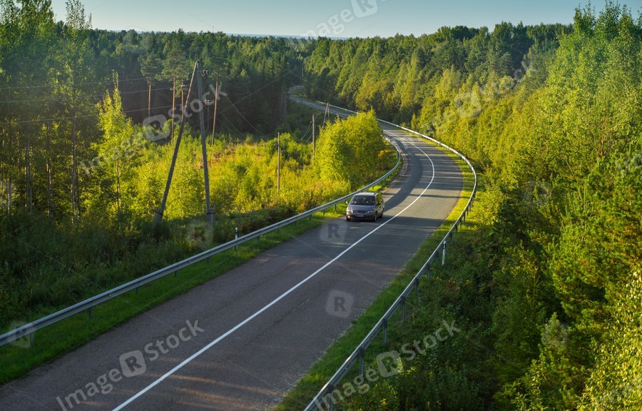 Highway in the forest. Tent on a night beach. Summer landscape. Car