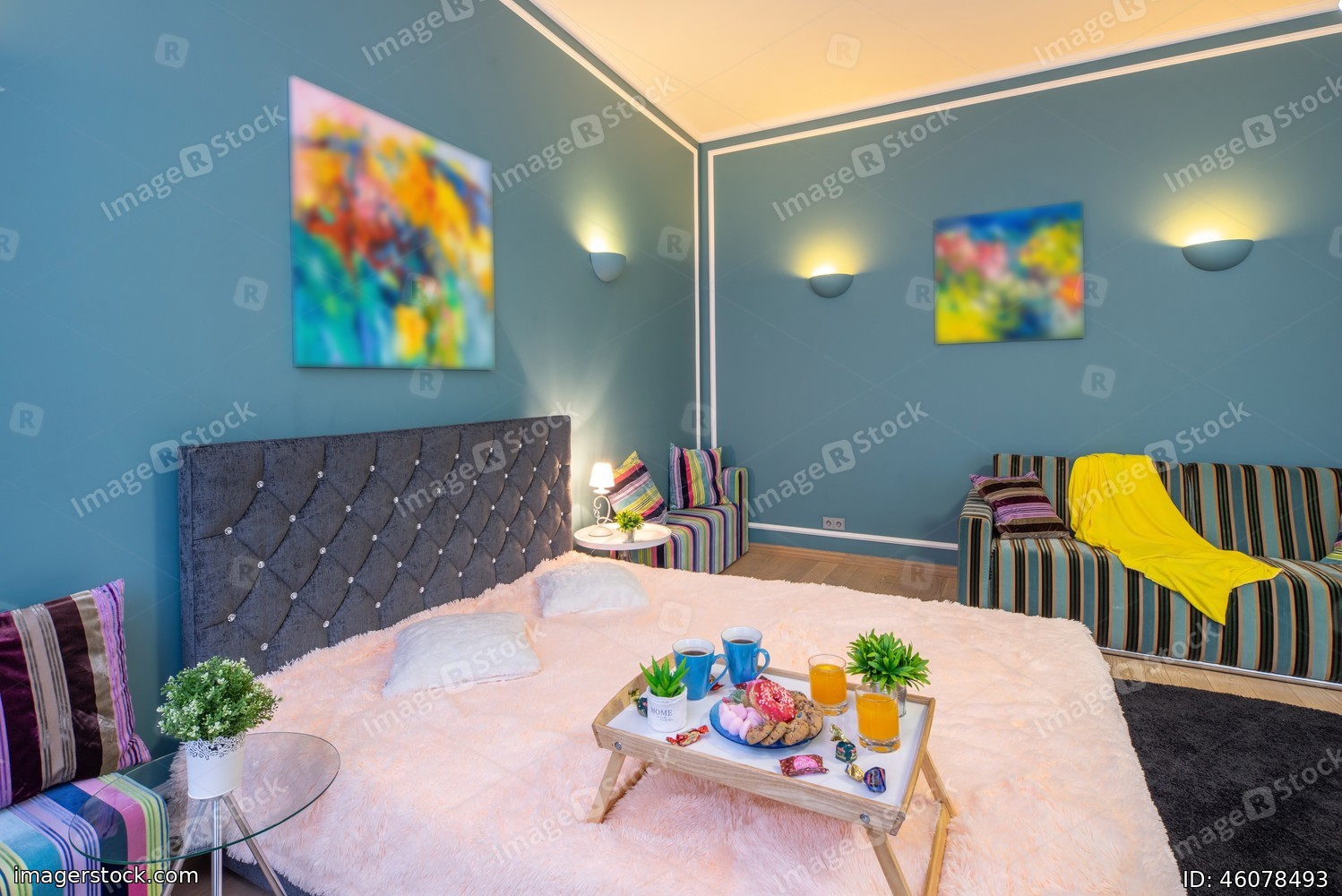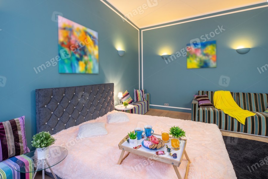 Modern interior of spacious studio apartment. Living room. King-size bed.