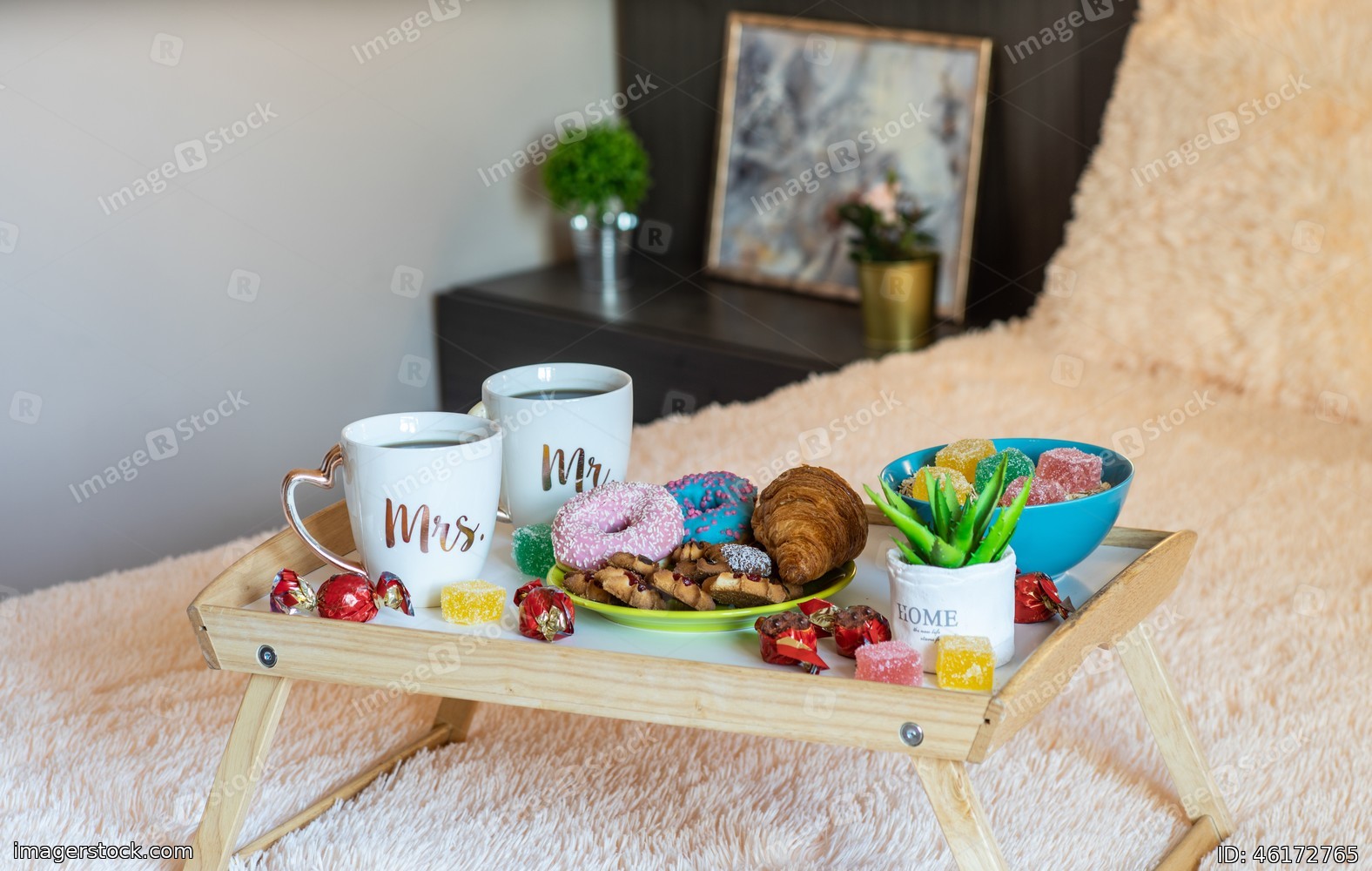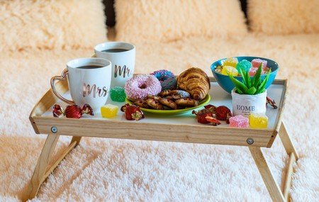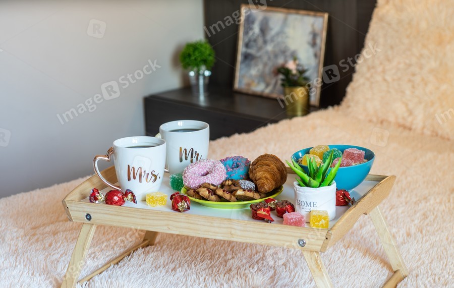 Romantic breakfast on the tray on the bed. Coffee ad pastry.