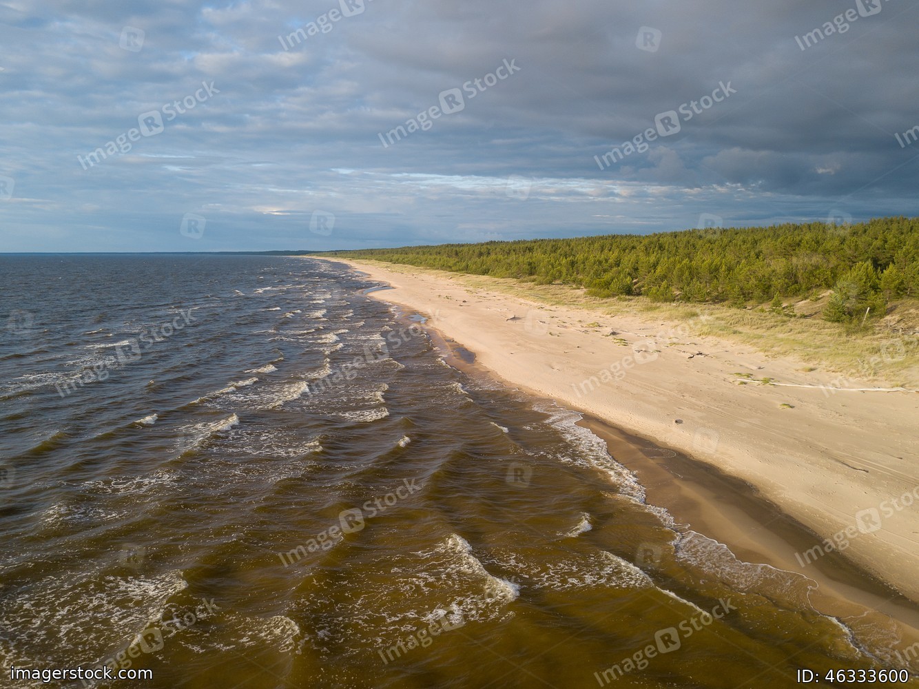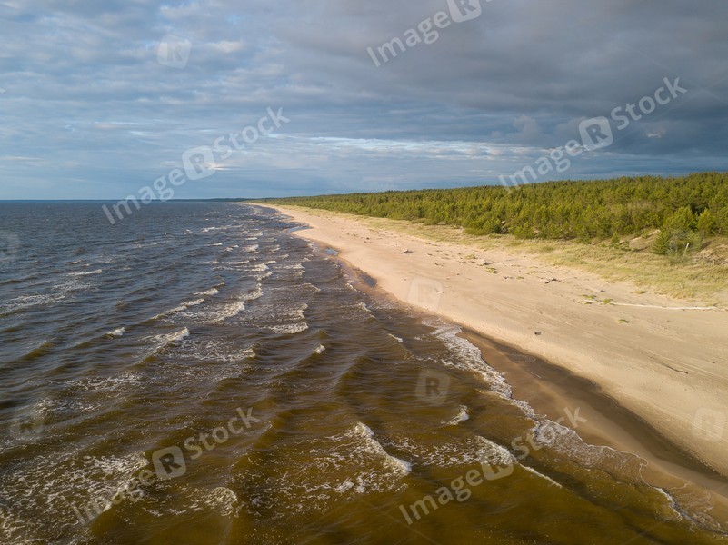 Beach on the sea, top view. Aero photographing a sea beach at sunset.