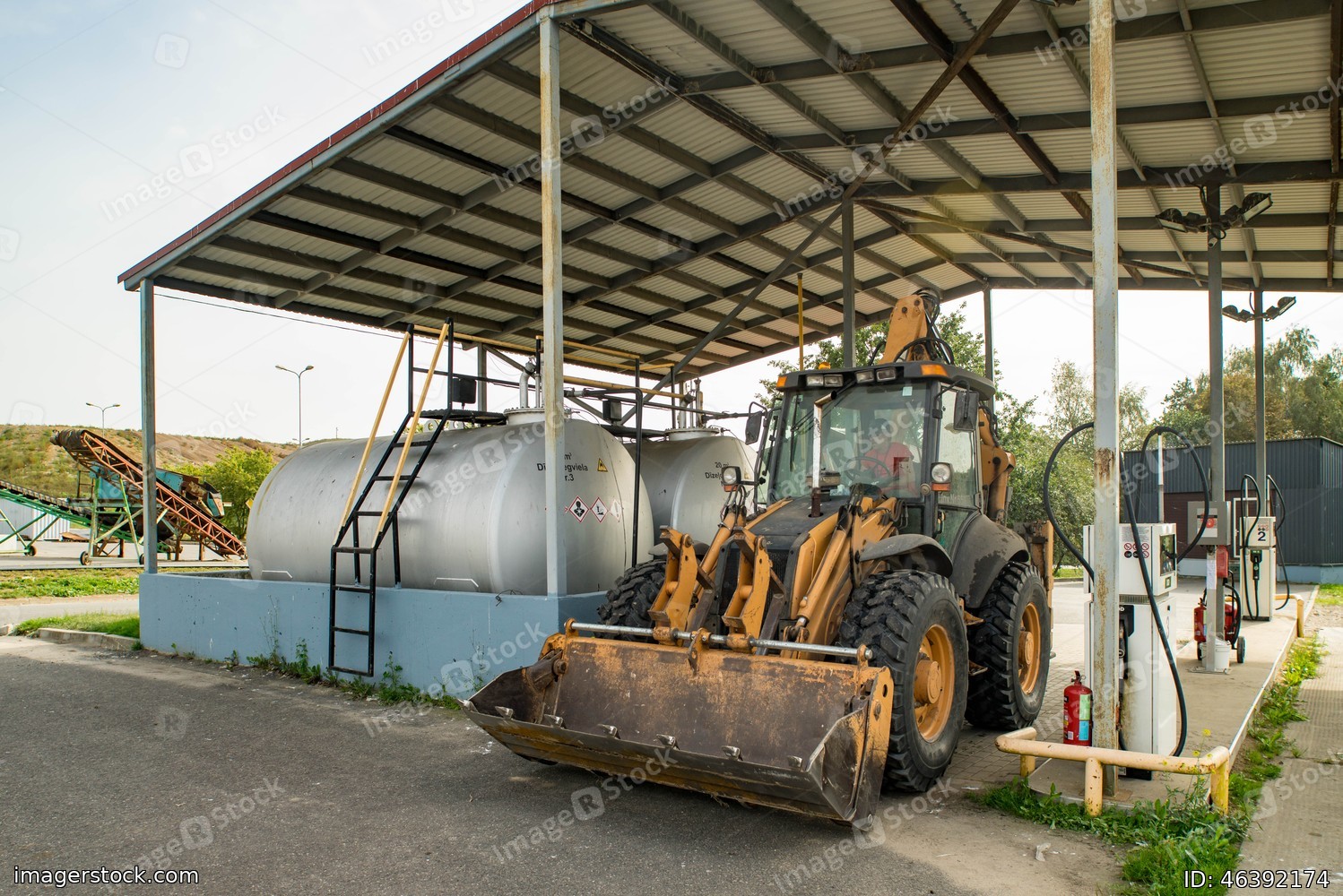 Yellow tractor on gas station. Refill. Heavy equipment. Tanks with fuel.