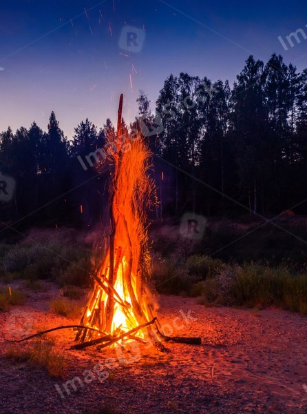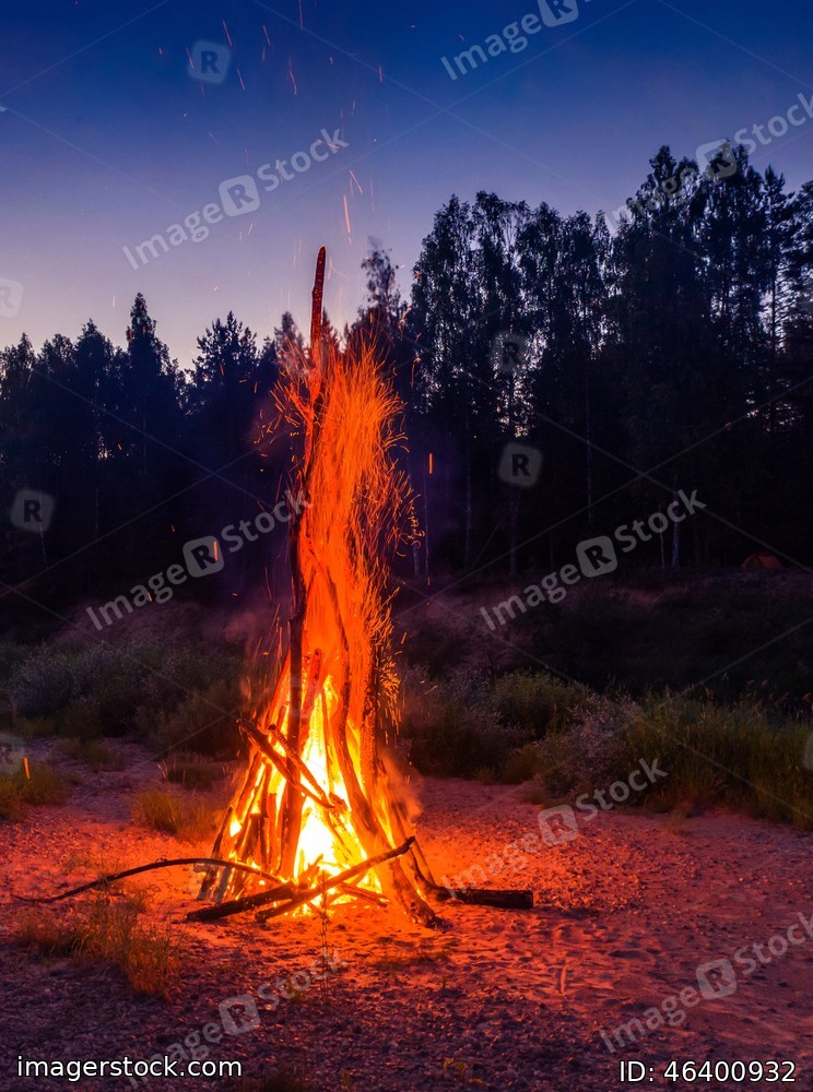 Traditional midsummer Ligo celebration in Latvia. Huge bonfire. Scenic landscape of forest at white night. Sunset sky.