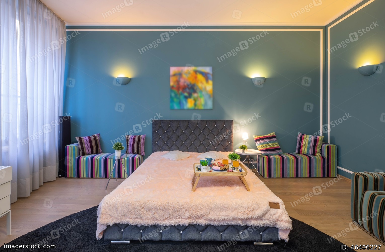 Modern interior of spacious studio apartment. Bedroom. King-size bed.