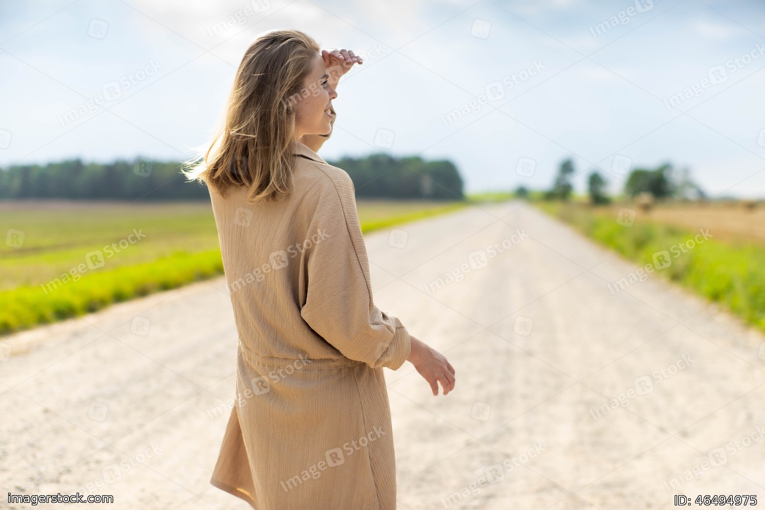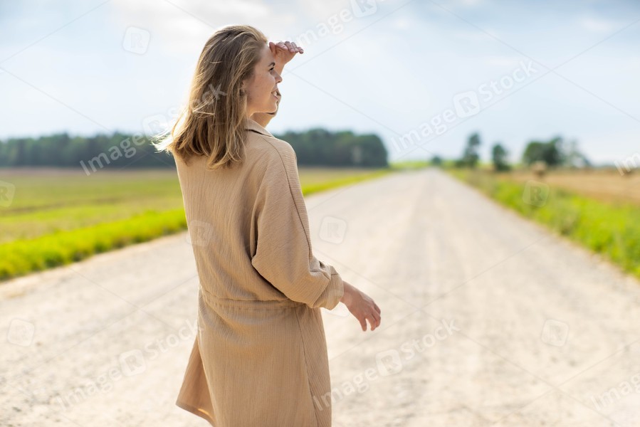 Woman in dress is walking on the road. Summertime.