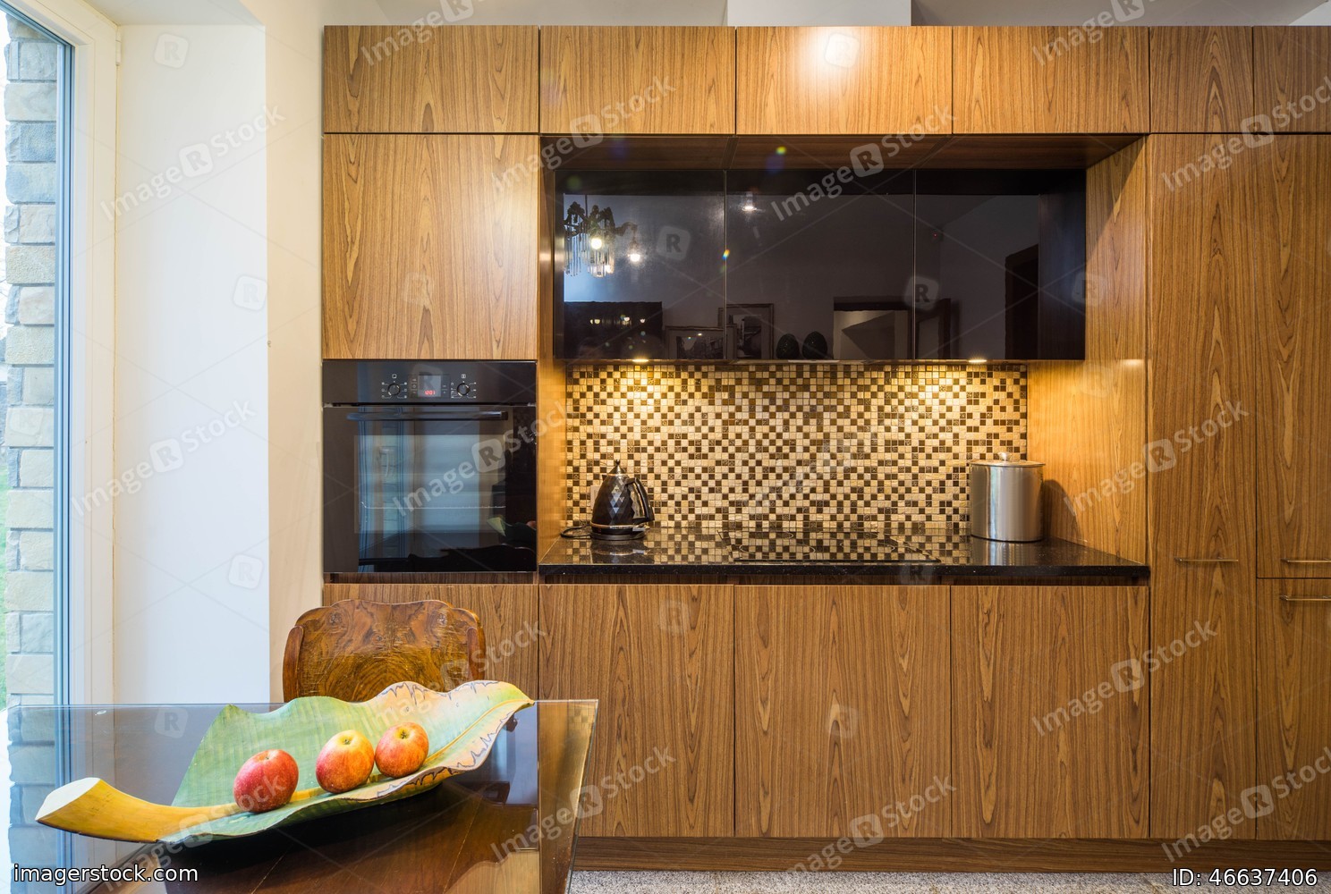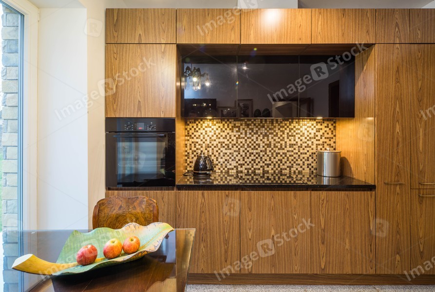 Interior of modern kitchen in private house. Wooden kitchen set. Home appliances. Plate with apples.