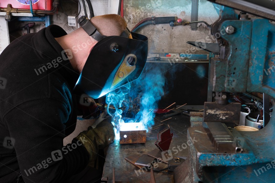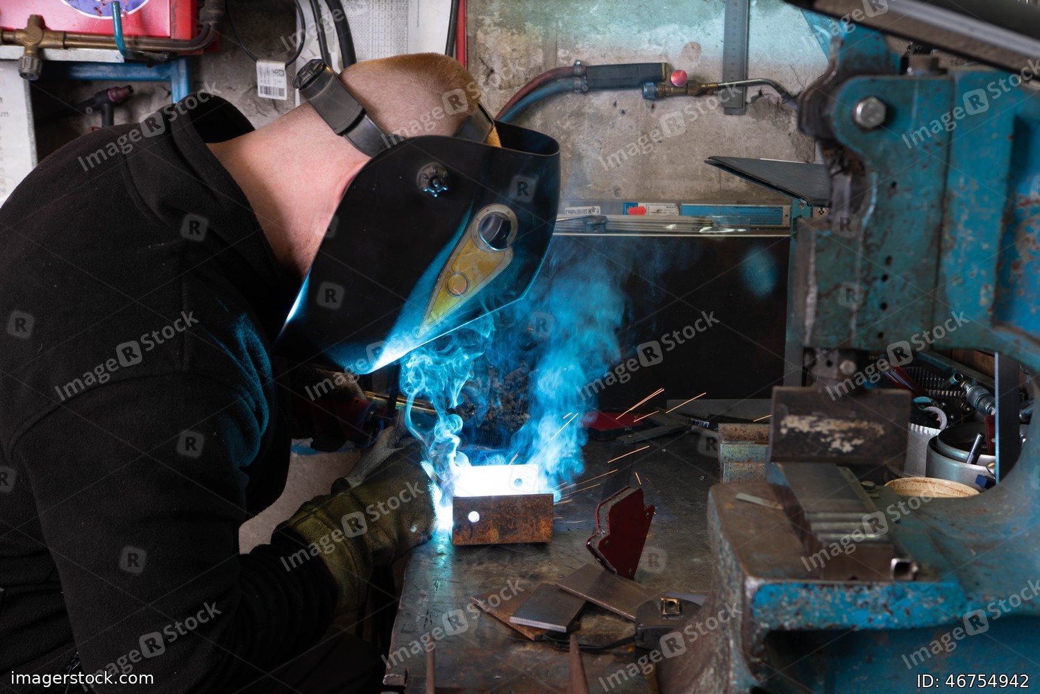 Worker in welding mask at factory. Welding process. Electric welding. Bright blue.
