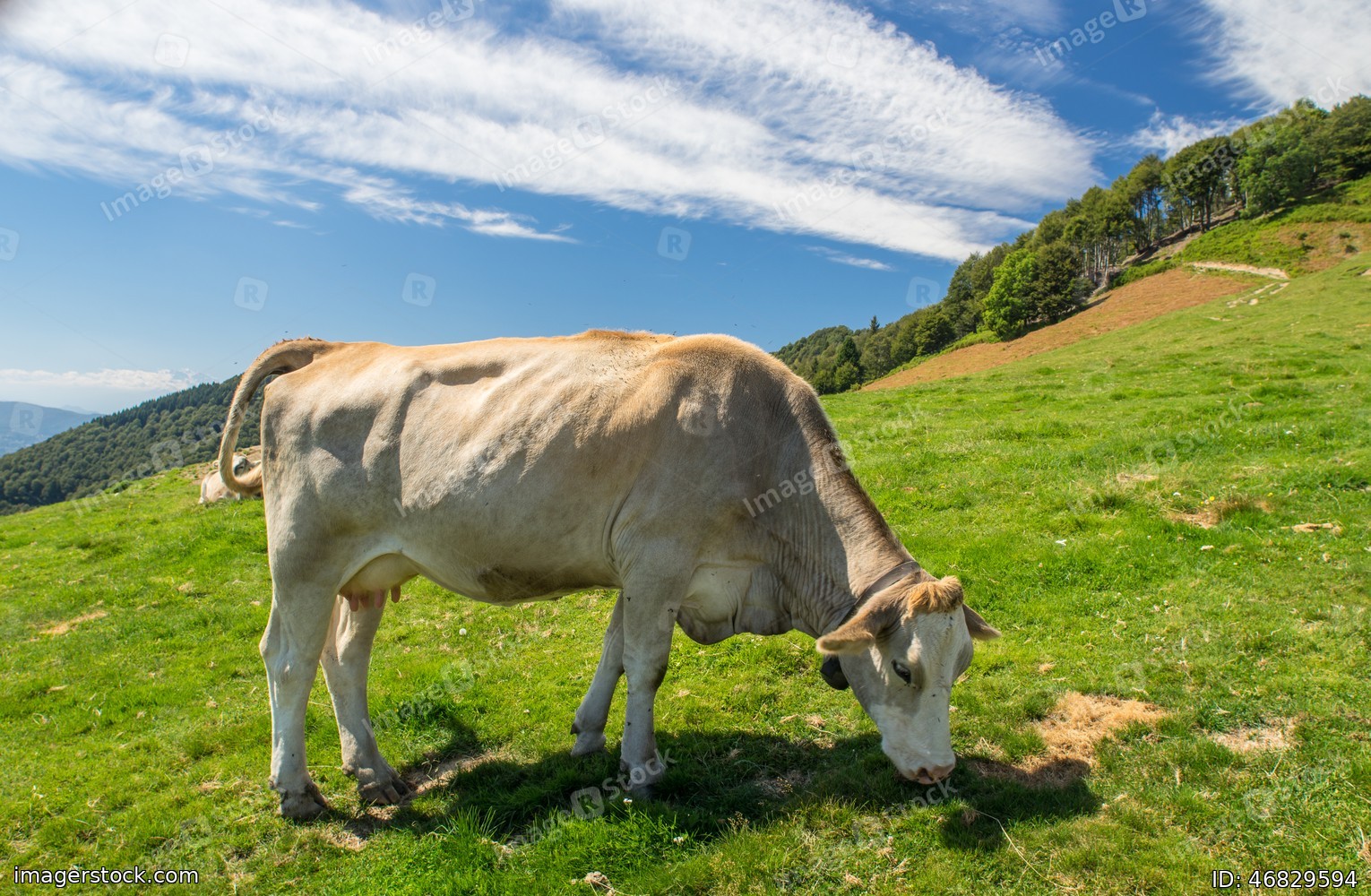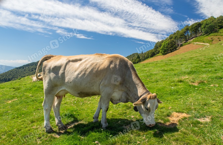 The pasture in the mountains. Cows grazing on the hills. Italy.