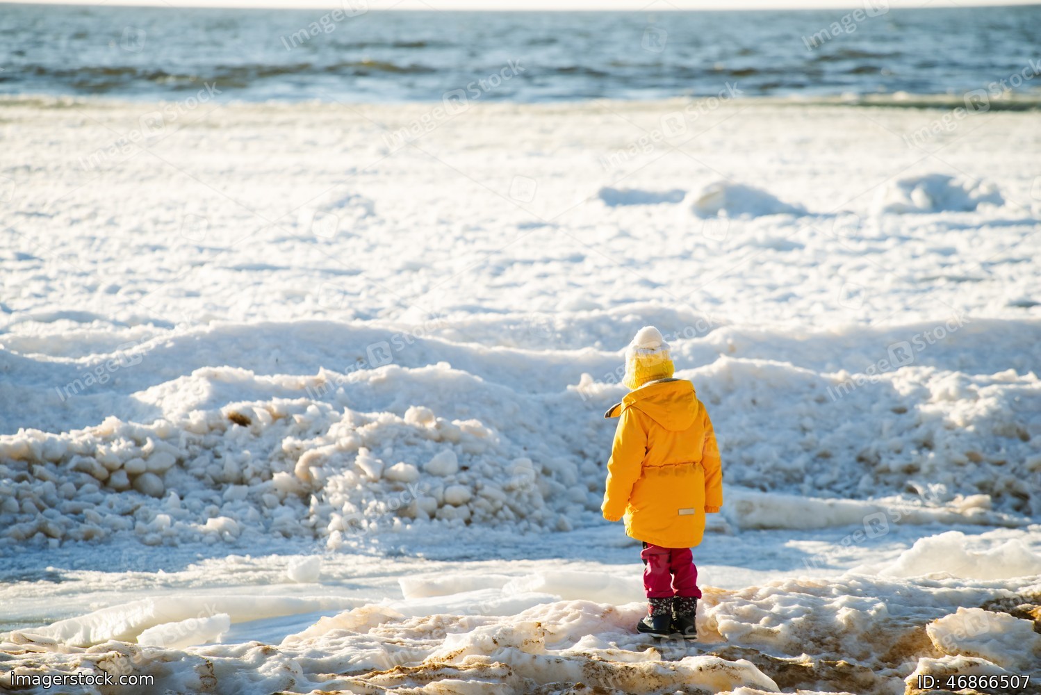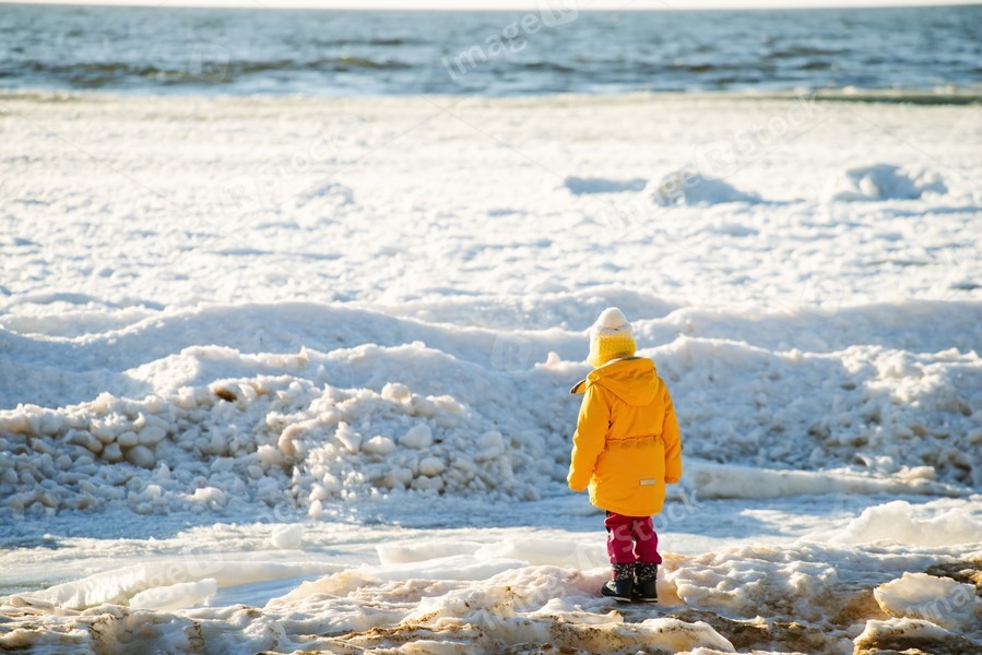 Little girl in yellow jacket walks on snow at sunny winter day.