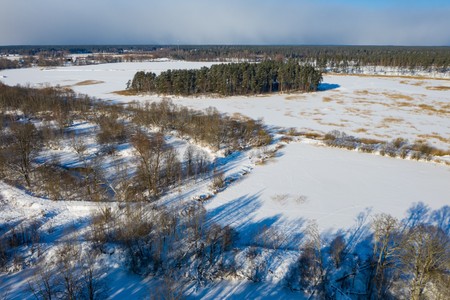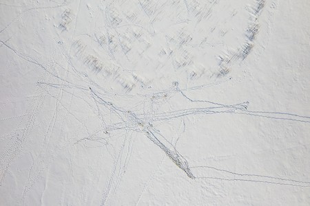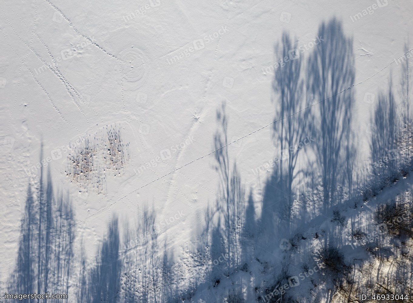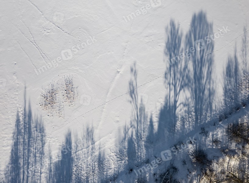Top drone view of shadows of trees and footprints on white snow.