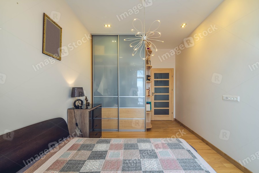 Contemporary interior of luxury bedroom. White walls. Cozy bed. Sliding glass door wardrobe and wooden shelves with books.