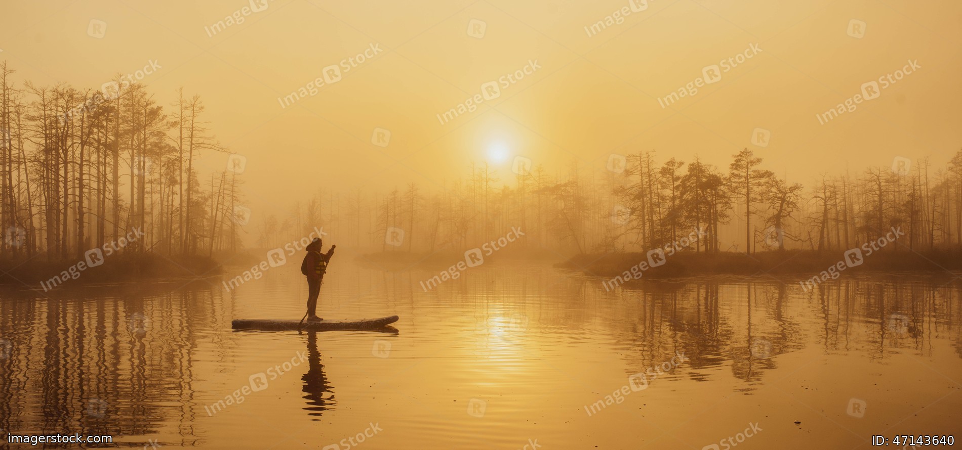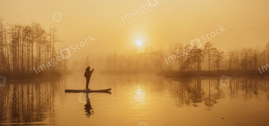 Woman slowly floating on the water on the sup-board. Fog and swamp.