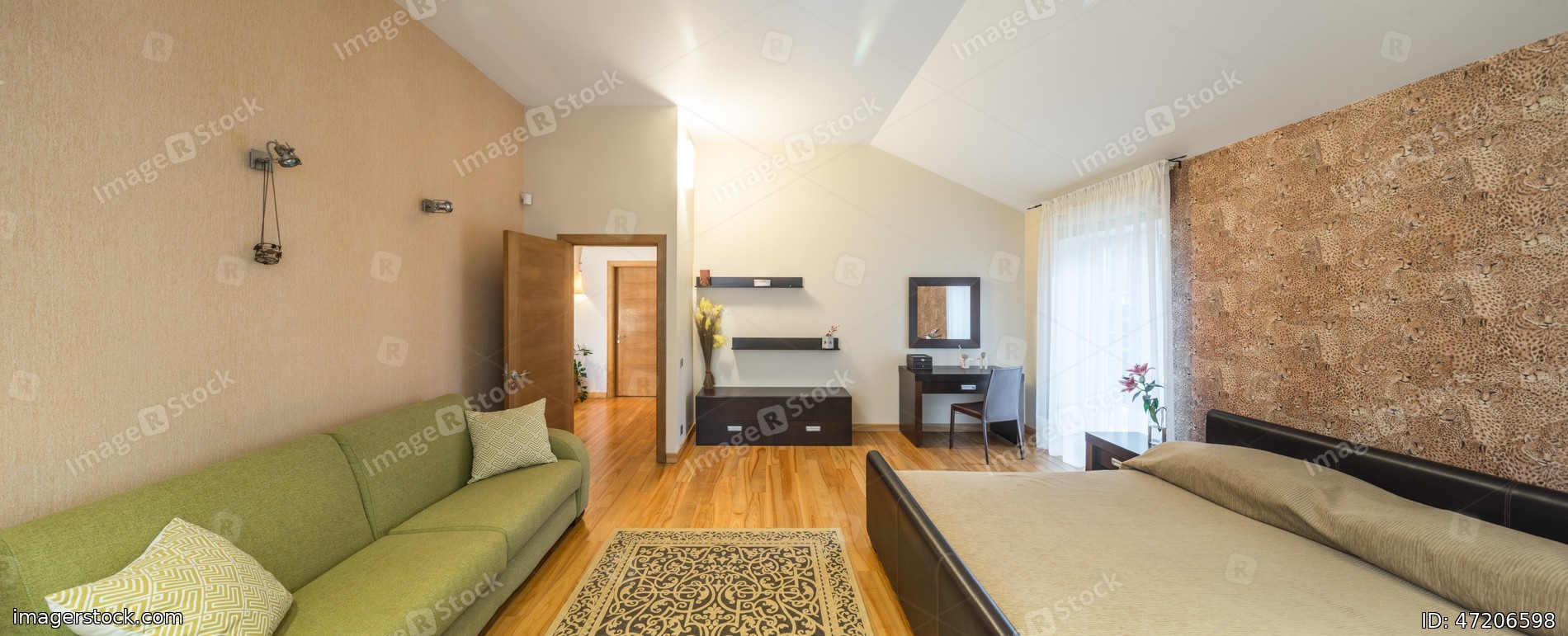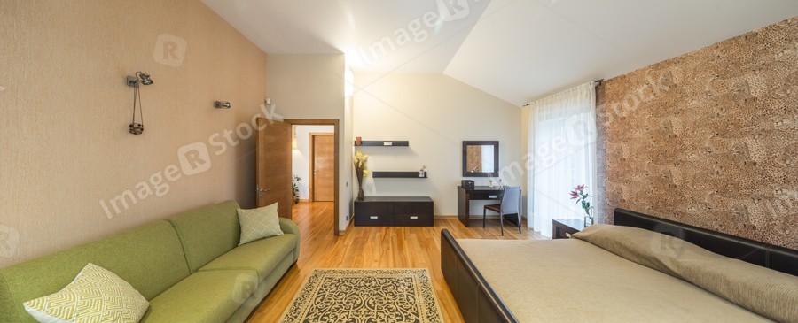 Panorama of cozy light bedroom with furniture.
