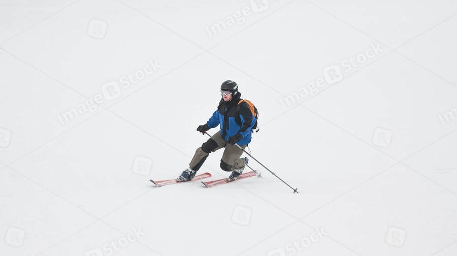 A man goes skiing on a snow-covered ski track. Ski resort. Fast moving. Winter sport.