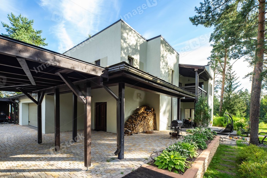 Modern exterior of luxury private cottage. Woodpile near wall. Green garden and terrace. Barbecue. Wooden canopy.