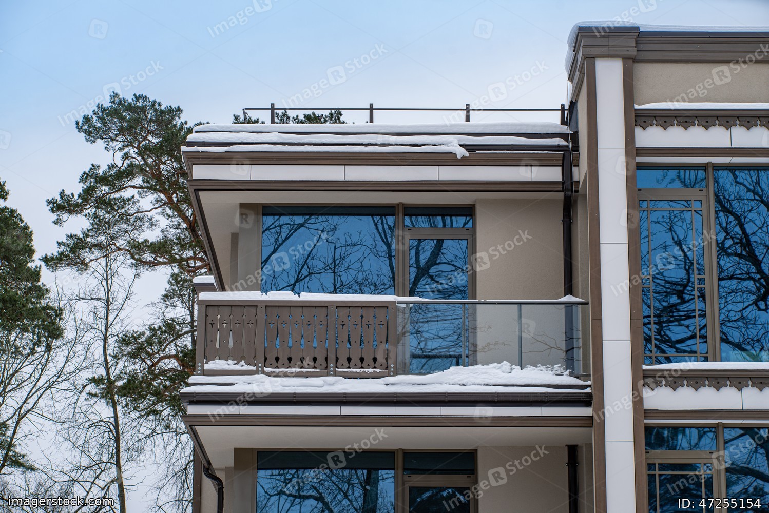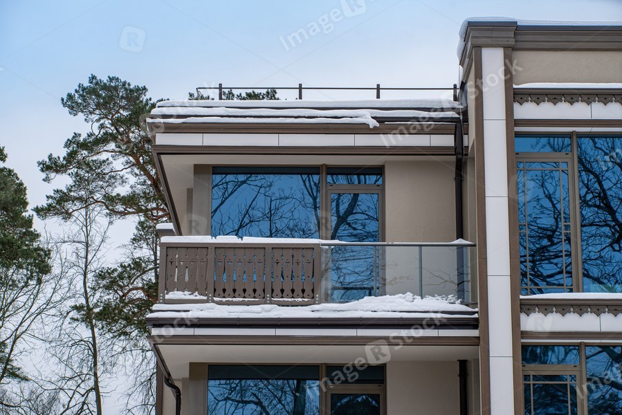 Modern exterior of luxury private house. Part of facade. Balcony.