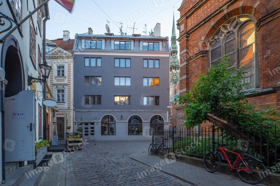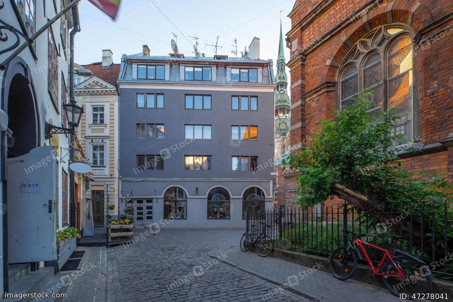 Modern exterior of building. Summer day. Green tree. St. Peter's Church.