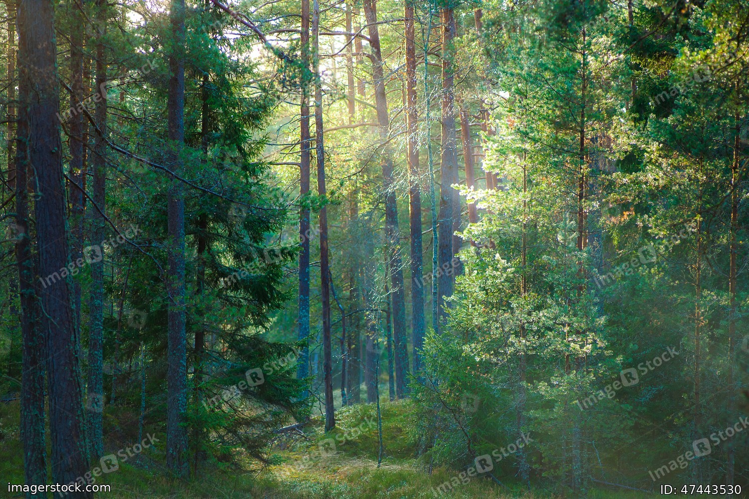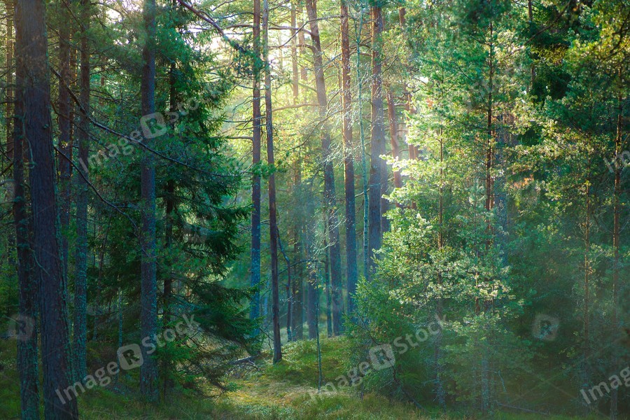 Fir forest at sunrise. Summer forest. Morning.