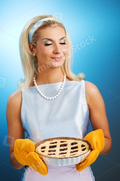 Beautiful woman holding hot italian pie. Retro stylized portrait