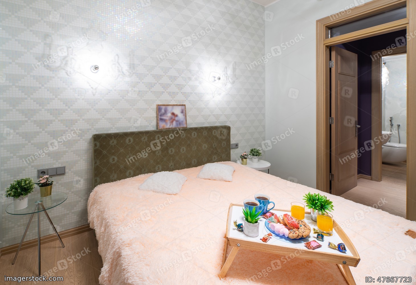 Modern interior of bedroom in studio apartment. King-size bed.