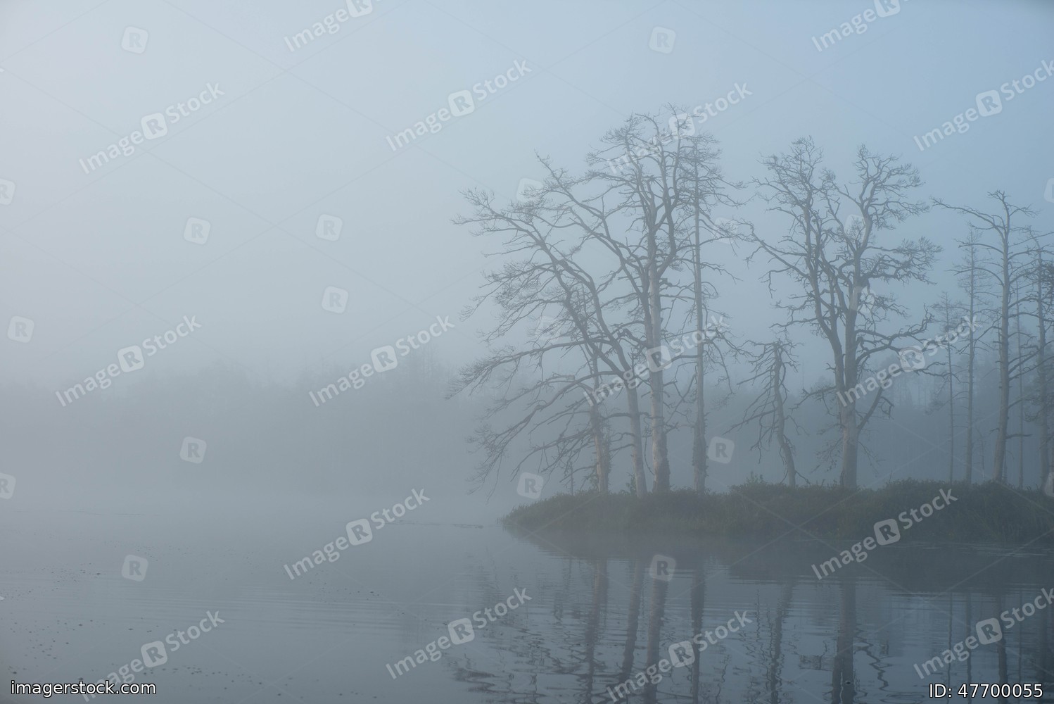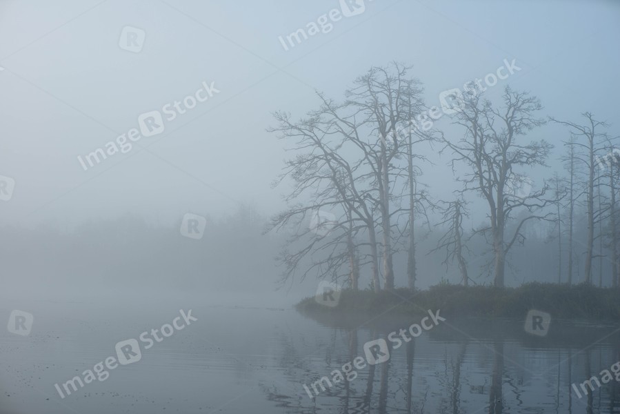 Landscape of misty swamp. Reflection in water. Forest and fog.
