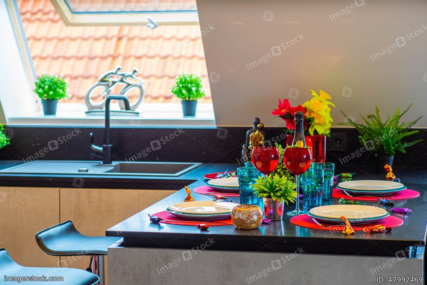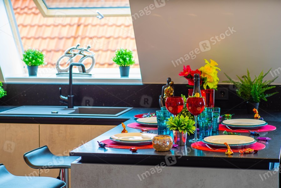Close-up of the set table. Clean dishes and glasses. Bottle of wine. Decorative flowers. Modern interior.