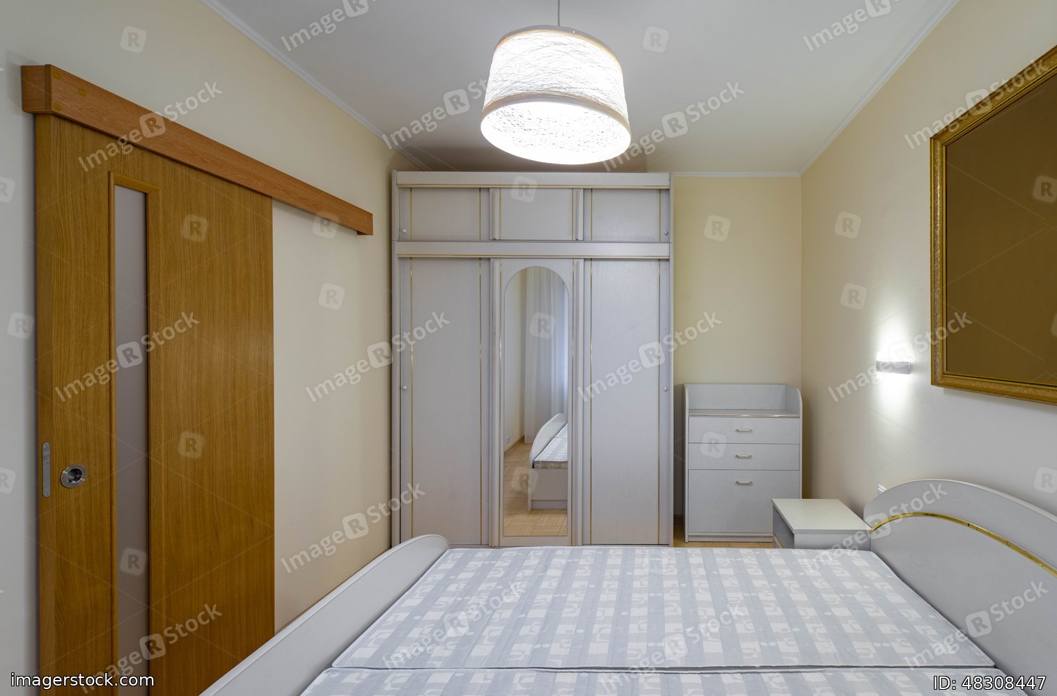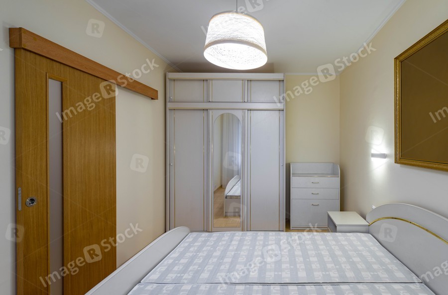 Contemporary interior of bedroom in modern flat. White furniture. Sliding wooden door. Wardrobe with mirror.