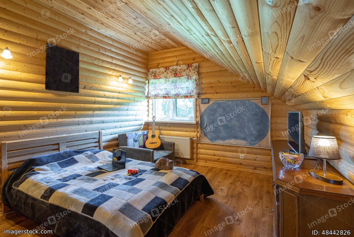 Wooden interior of attic teenager bedroom with furniture. Private country house.