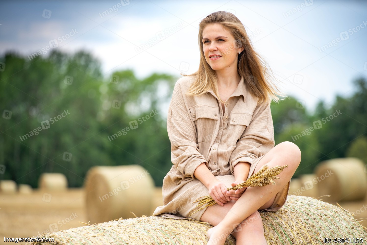 Beautiful happy woman seating on a haystack.